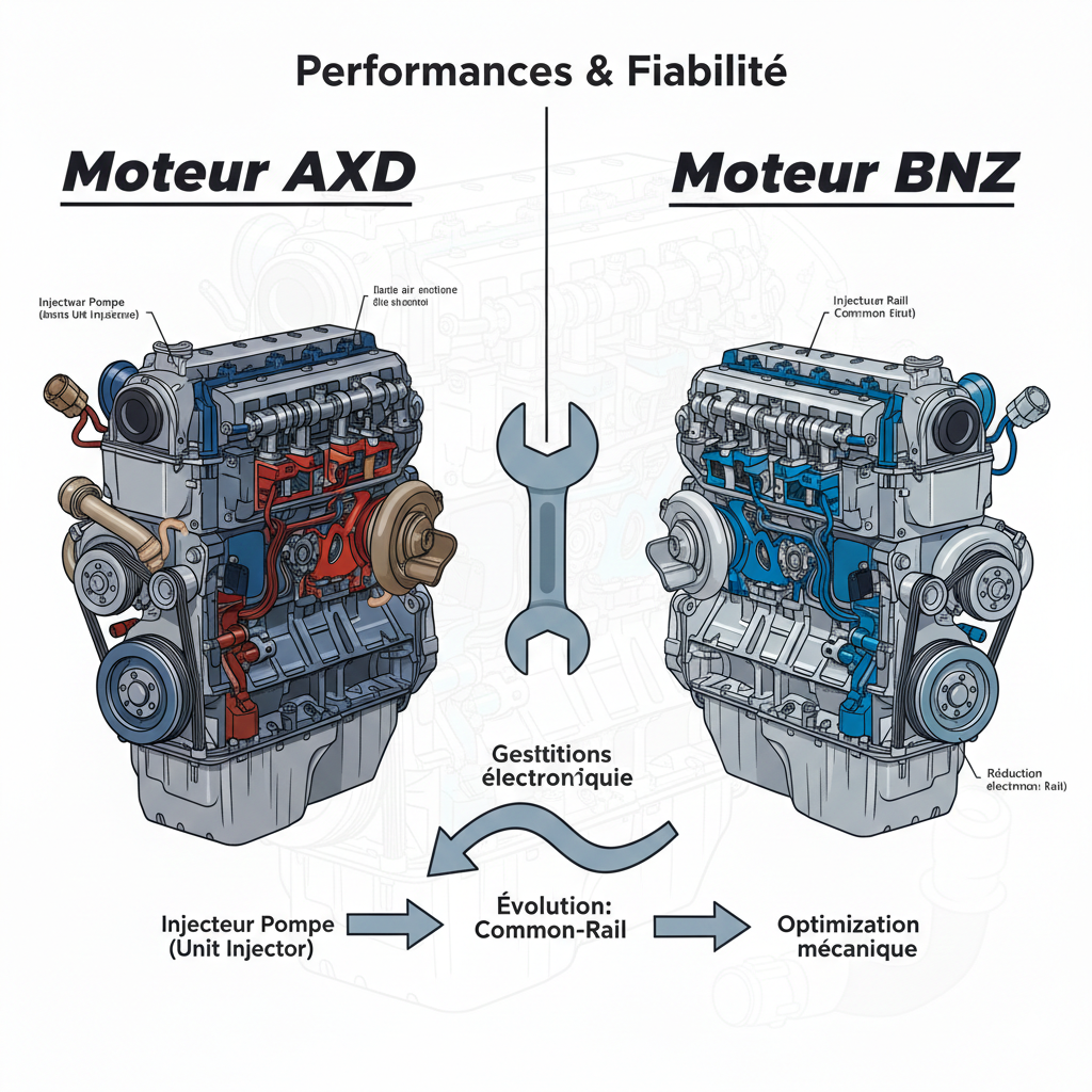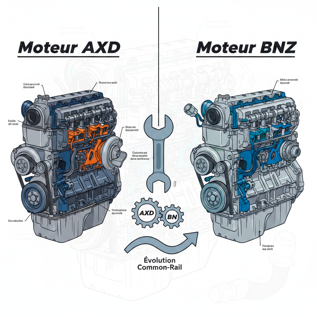 - AXD et BNZ se ressemblent, mais les montages et pièces périphériques (turbo/support/admission/gestion) peuvent être différents.