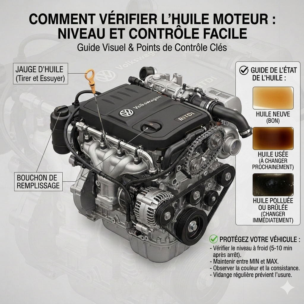- Après long trajet : si vous suspectez une consommation d’huile, vérifiez une fois le moteur reposé.